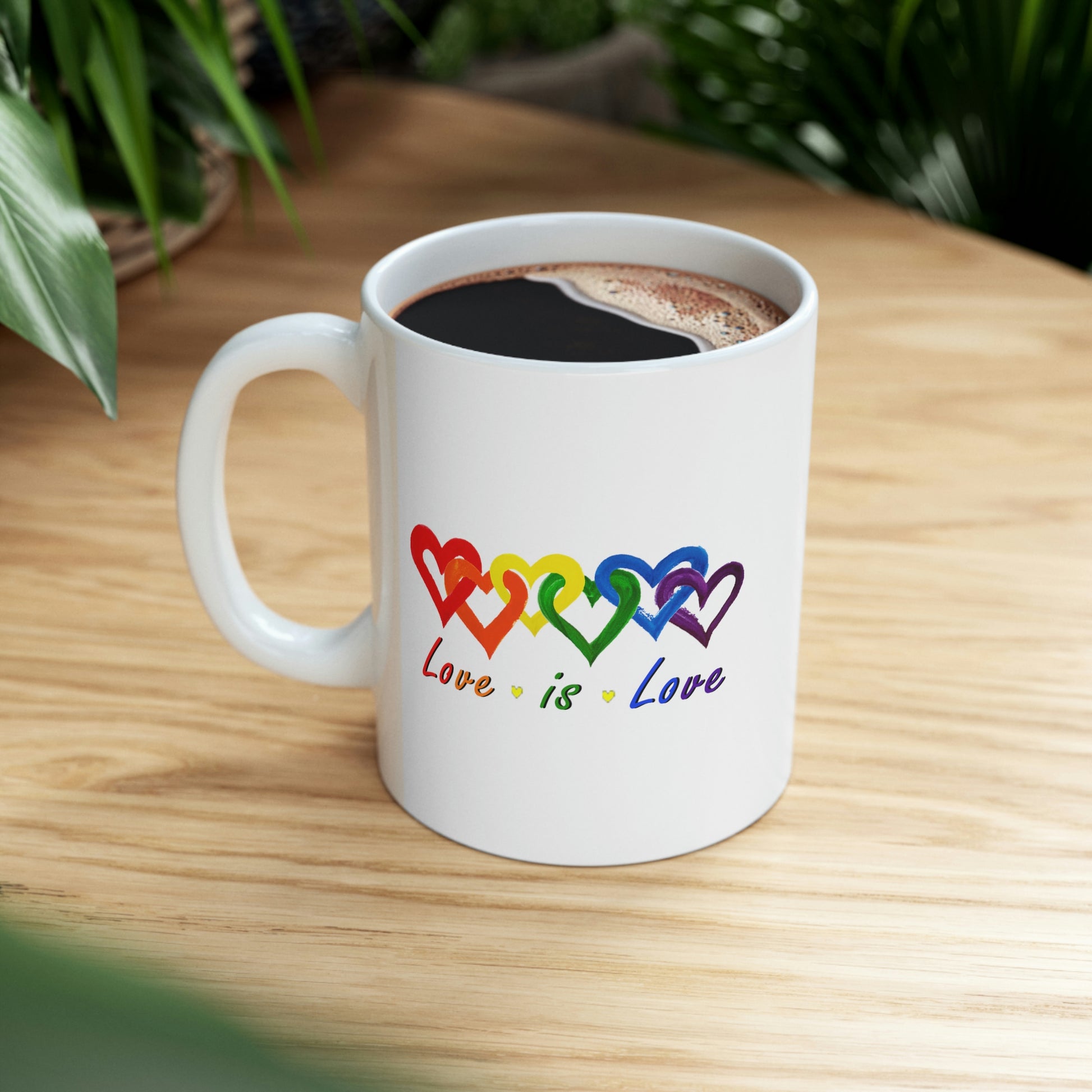 Made of white, durable ceramic, this 11 oz mug is BPA and Lead-free, as well as being both microwave & dishwasher-safe. It's perfect for enjoying your favorite hot beverage while also showing you believe Love Is Love, regardless of the gender of those who feel it.